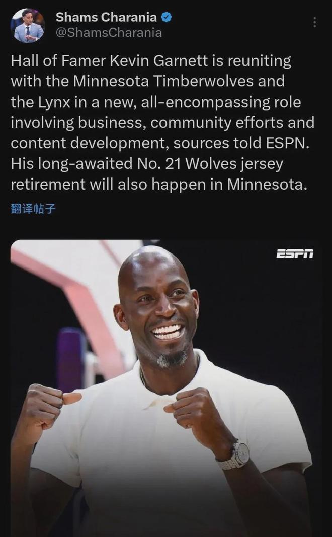 揭秘之王沙姆斯:加内特重返森林狼,承担起涉及商业运营、社区活动和内容开发的新角色,他的21号球衣将在明尼苏达州举行的仪式上退役。加内特,1976年5月19日出生,1995年首轮第五顺位,2016年宣布退役。在21年的NBA生涯中,常规赛场均贡献17.8分10篮板3.7助攻1.3抢断1.4盖帽。季后赛,他场均贡献18.2分10.7篮板3.3助攻1.2抢断1.3盖帽。在他的NBA生涯中,加内特获得了无数的荣誉。他获得过1次MVP、1次总冠军、1次DPOY、9次入选NBA最佳阵容、12次最佳防守阵容、4次篮板王、15次入选全明星、入选2020年名人堂成员、帮助美国男篮获得一次奥运会金牌等等。加内特分别效力于森林狼队、凯尔特人队和篮网队。森林狼队是他的球队他职业生涯的终点也是在森林狼队。他实现了无数球员梦想的起点和终点。从1995-2007年和2014-2016年,加内特总共穿着森林狼队球衣效力了14个赛季。加内特在2016年就退役了,但是到现在球衣的退役却一直被推迟……毕竟不能完全归咎于森林狼,只能说情有可原。这位传奇球星与前森林狼主帅格伦·泰勒发生了严重冲突,并拒绝让球队退役他的球衣。直到2021年森林狼以15亿美元转手,情况才逐渐好转。森林狼新任老板马克·洛尔和亚历克斯·罗德里格斯表现出了极大的诚意。自接手以来,他们就把修补与球队热门球员的关系作为首要任务。这赢得了加内特的好感,大家也找到了共同点,重归于好。自然,他的21号球衣的退役仪式也被安排在了提上议程。恭喜狼王,终于可以回家了。明尼苏达市已经等待他们的英雄九年了。未来,他不需要等待。努力之后的回报更是令人难忘。